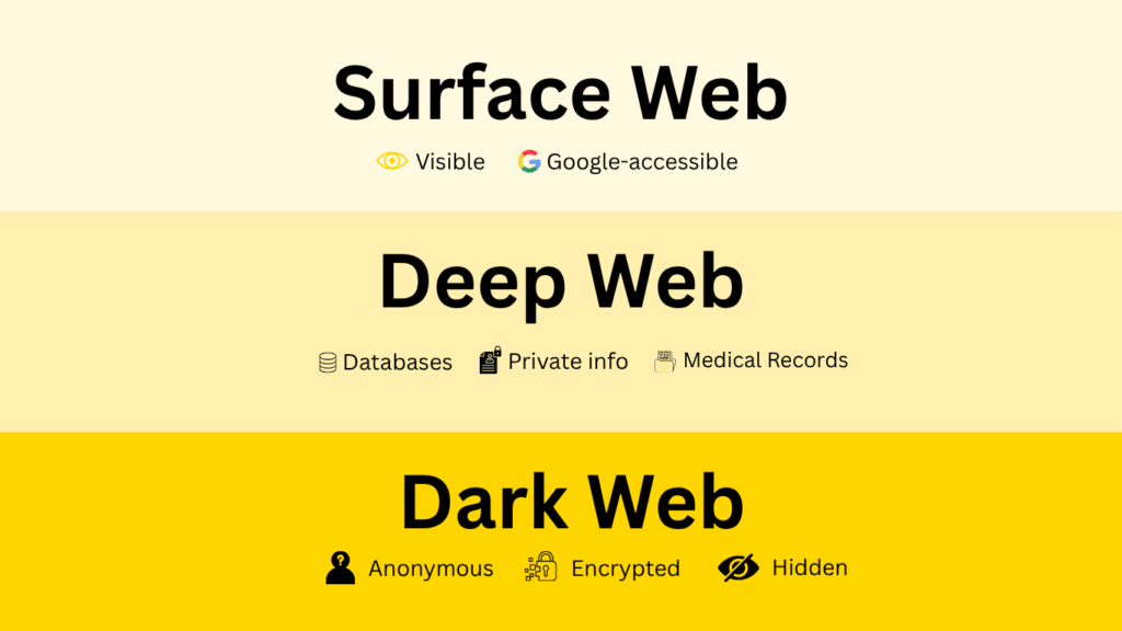 The dark web is different from the surface web and the deep web. You can use normal browsers to access the surface web, but databases and medical records are only accessible through the deep web. The dark web is purposely hidden.